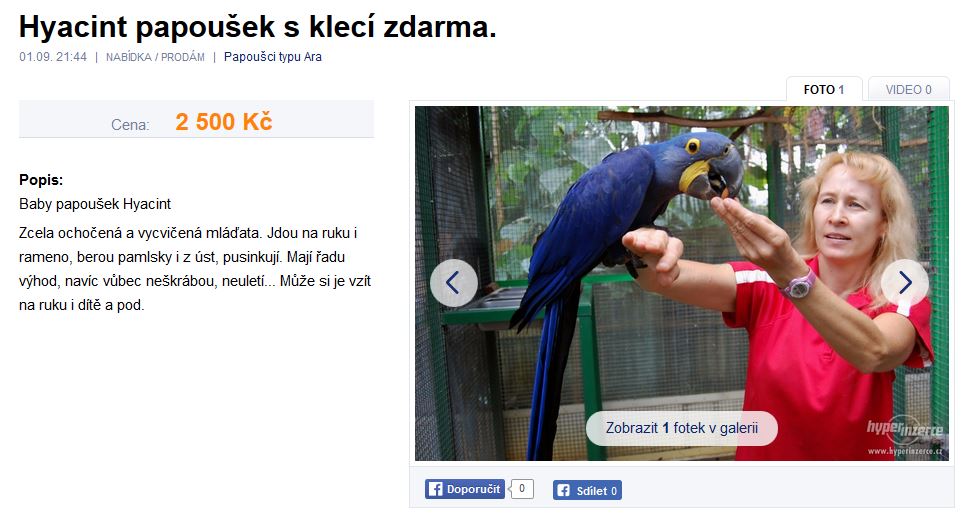 Pokud se necháte zlákat nabídkou některých inzertních serverů typu „Žako šedý 5 500.- Kč“, „Ara Ararauna 8 000.-Kč“ a „Ara Hyacintový 9.900.- Kč“ a chcete si touto cestou papouška pořídit, je především nutno konstatovat, že jste jako budoucí majitel tak inteligentního zvířete jako je papoušek zcela nezodpovědný, nezpůsobilý a je vaší občanskou povinností vaše finanční prostředky vzít a zcela neprodleně je odeslat na 107-9272440297 / 0100 variabilní symbol - 1234 což je účet společnosti Laguna - Magdalény Žohové, která se stará o handicapované papoušky, protože tím alespoň učiníte dobrý skutek. I sebemenší papoušek ví, že cílem takových nabídek není nic jiného než vás připravit o finanční prostředky a tímto zcela podvodným způsobem samozřejmě nikdy žádného papouška nezískáte.Papoušek v akci v obchodních centrech