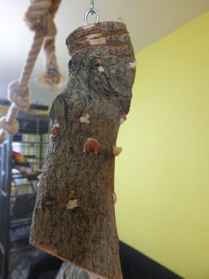 Velmi oblíbené jsou tyto hračky na zavěšení. Naši papoušci je milují a je to vidět i s jakou vervou je likvidují. Na výrobu používáme to, co zrovna doma a nebo v lese najdeme. Proto se u nás nevyhazují ruličky od kuchyňských utěrek a nebo třeba toaletního papíru, vše se použije. Také občas zajdeme na truhlárnu, kde se dá sehnat kvalitní "odpad" v podobě malých dřívek a může se jít montovat.Kmen s oříšky - do kmenu navrtám díry a do nich nastrkám slunečnici nebo oříšky, opět zábava a spojená s potravou.