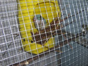 Houpačku má každý papoušek rád a tak je to skoro první věc, kterou do klece i mimo děláme. Stačí najít vhodnou větev a na konec přidělat provázek. My co máme Ary, tam raději dáváme řetízek a nahoru s karabinkou, ať se to dá dobře přendavat dle libosti. Venkovní prolejzačky, to už je pak větší tvořivost. Vždy záleží na prostoru a fantazii. Dle mě nejjednoduší a také velmi oblíbená hračka je kus členité větve, do které zašroubuji z vrchu očko a připnu na karabinku. Pro papoušky paráda, okusují čerstvou větev a ještě se houpou.