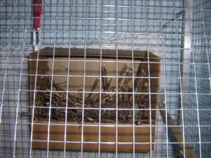 Mníšek stavitel, tomu je potřeba dát nějaký ten materiál a už se buduje domeček. A jako základ postačí krabice, bednička a nebo upletená "čepice".Bedýnka na dřívka, šišky, ořechy a jiné hračky na kterou volně navazuje "stoleček" na který si papoušci odkládají to s čím si zrovna hrají, takže jim to hned nepadá na dno klece. Stoleček funguje i jako odpočívadlo (mají v kleci dvě), jelikož se na něm sedí trošku jinak než na bidle.